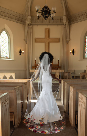 A single layer, chapel length veil with multi-colored floral lace detail along the bottom edge.