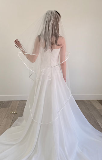 A double layer, circular cut, ballet length veil with a Mokuba ribbon edge.